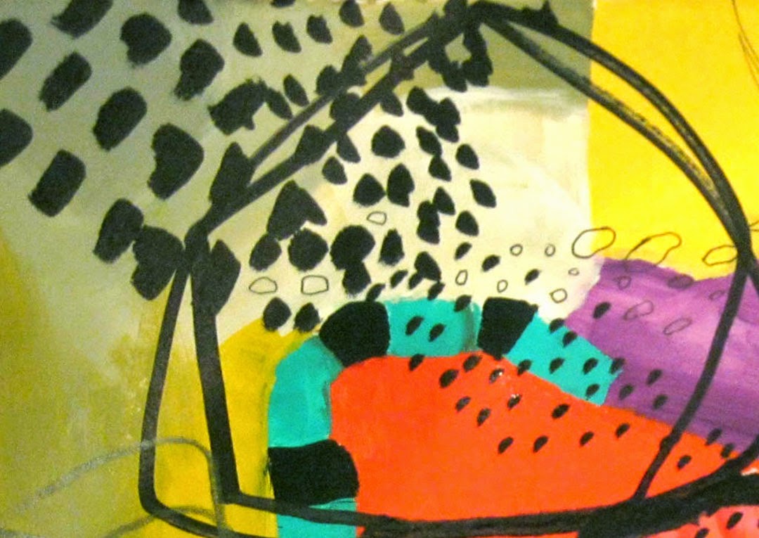 And here are two that I did as demos for my Postcards class. The project is to work on 8"x12" paper, and make a composition such that each quarter is different. Then you cut the piece into quadrants and you have four different postcards, 4"x6". That is the challenge: the postcards have to look like they did not all come from the same piece. It's a lot harder than it sounds.