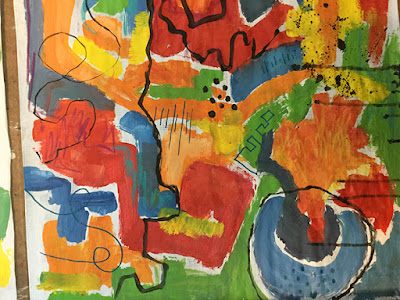 Helen Day Art Center in Stowe, Vermont. This time I approached the workshop a little differently than in the past, based on recent work in my own studio. First we made big fat lines and marks using paint and drawing materials. Then we created some collage fodder in color, including line and and pattern. The Big Fat Art pieces began with either collage (using said fodder) or paint, but ultimately made use of both.